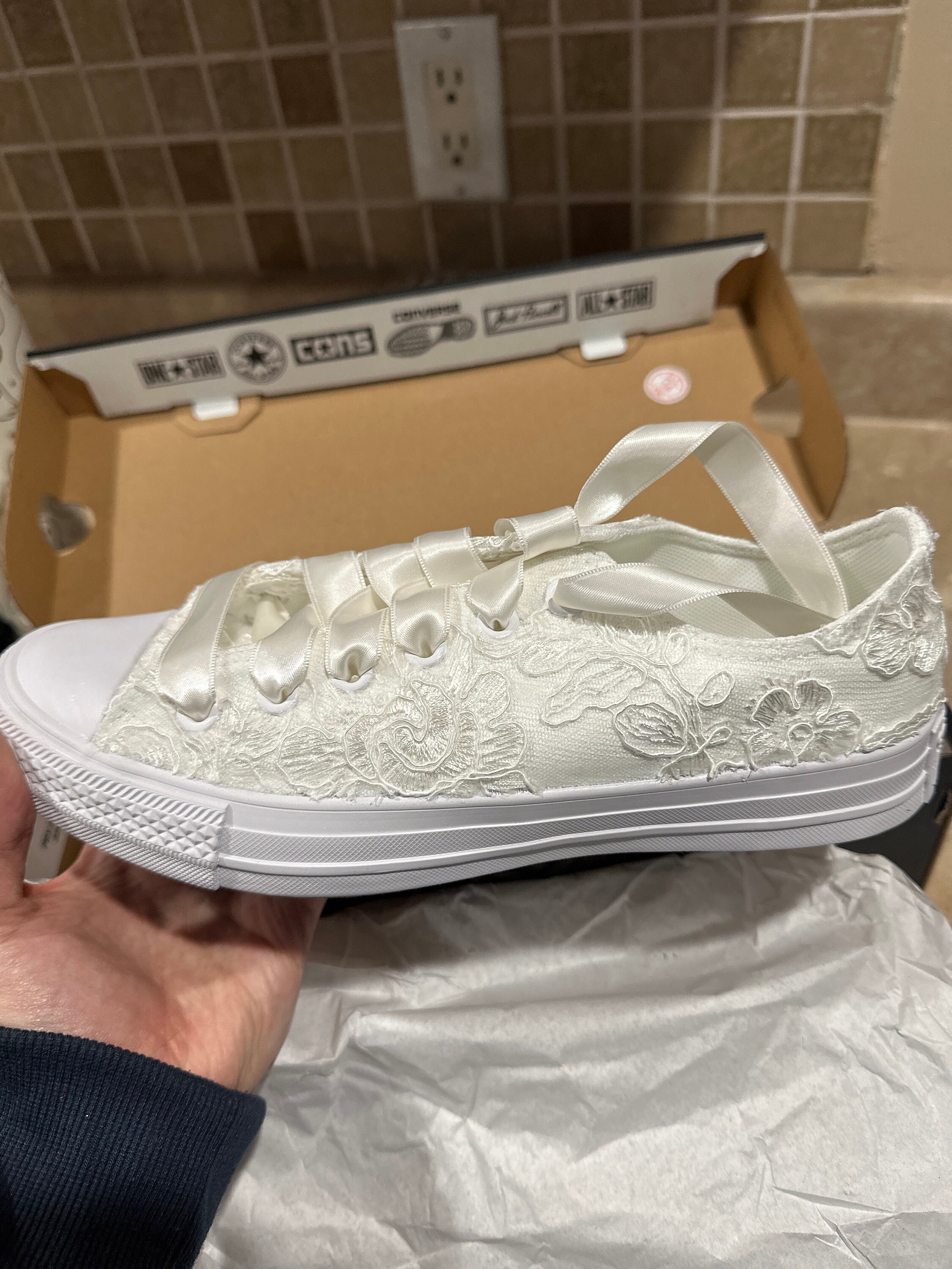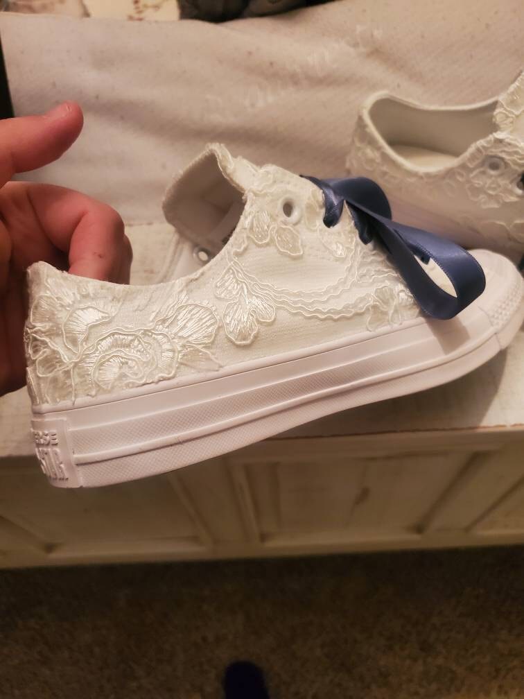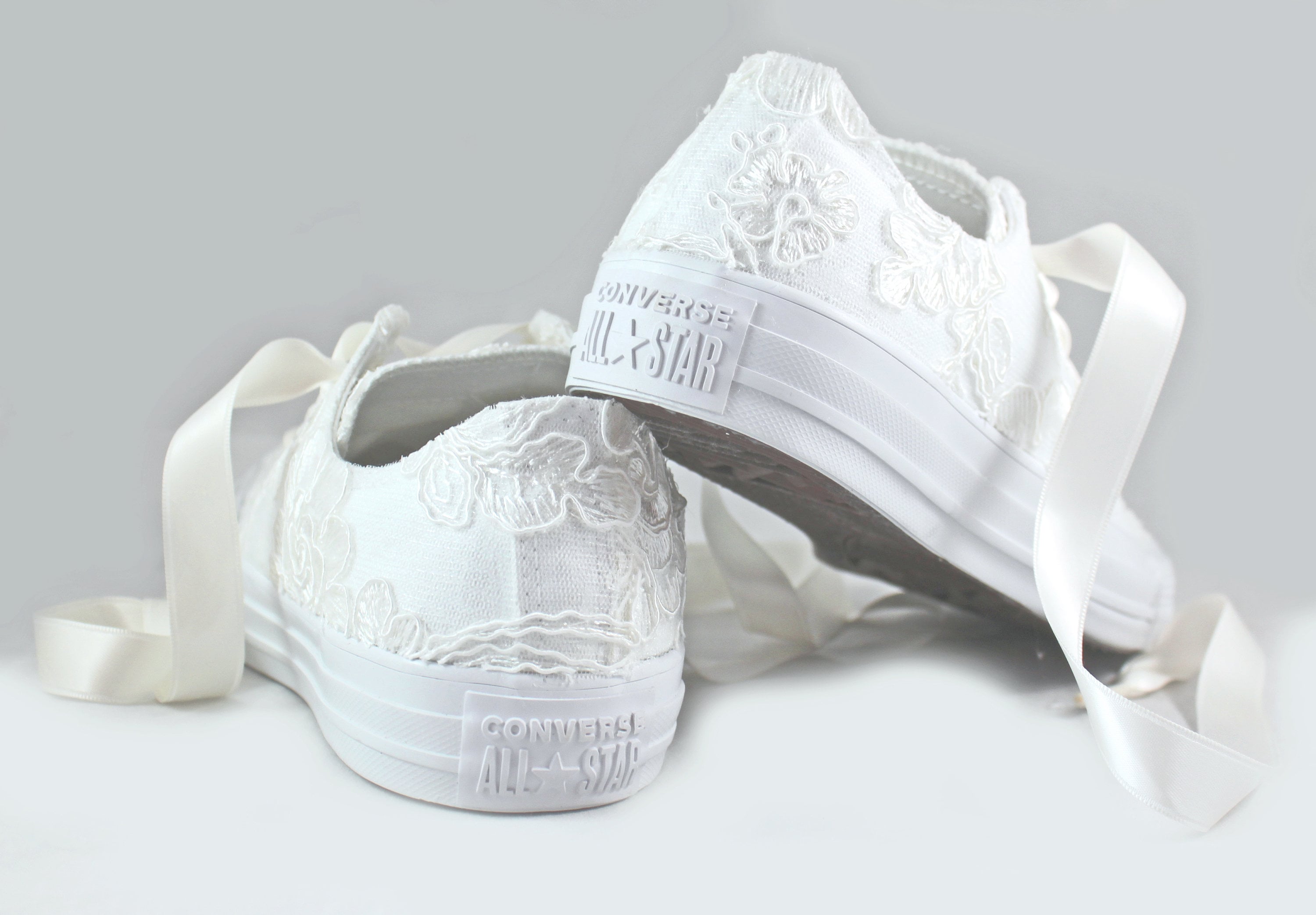 Skip down the aisle in comfort in these beautiful ivory lace Converses!