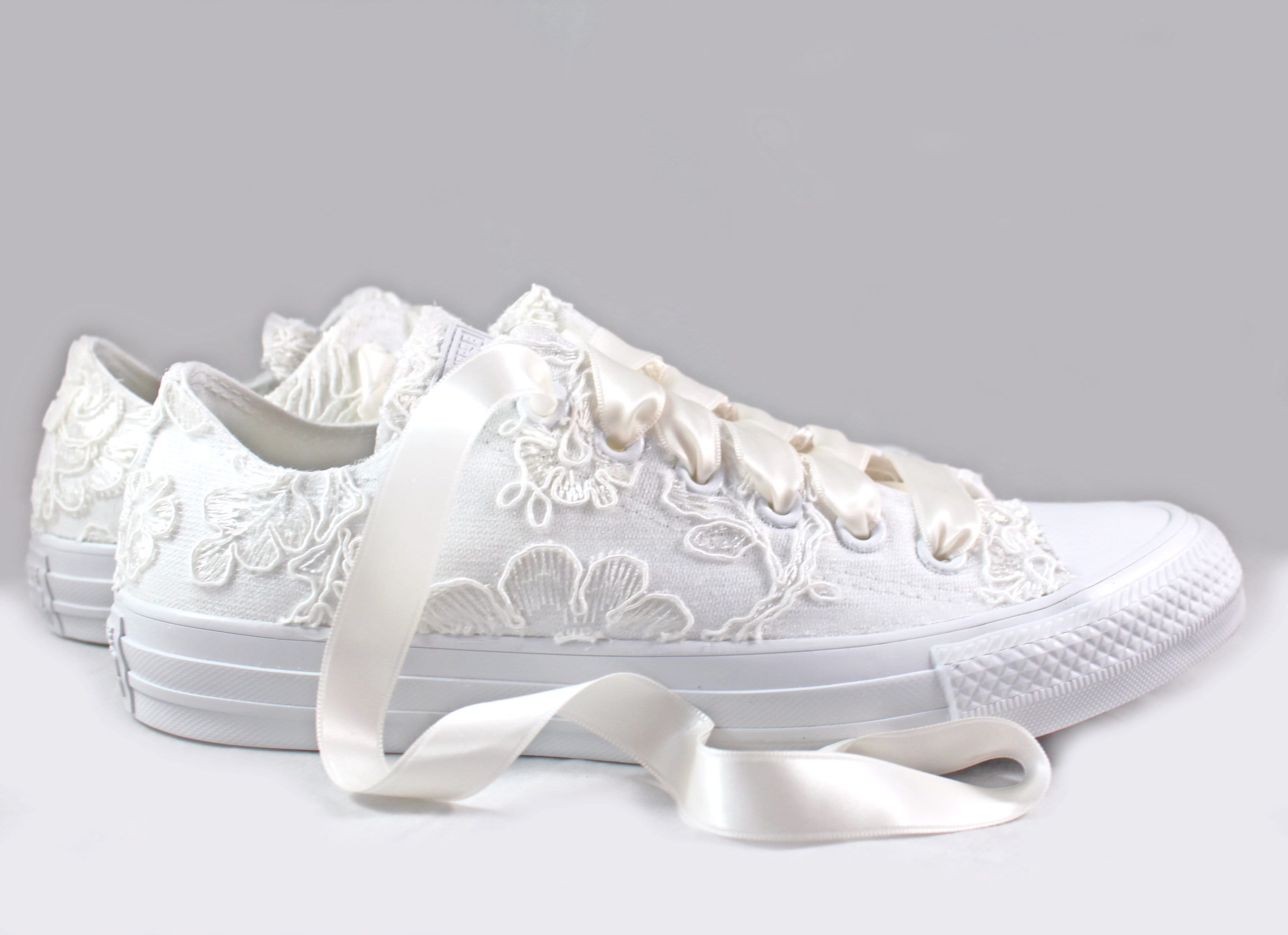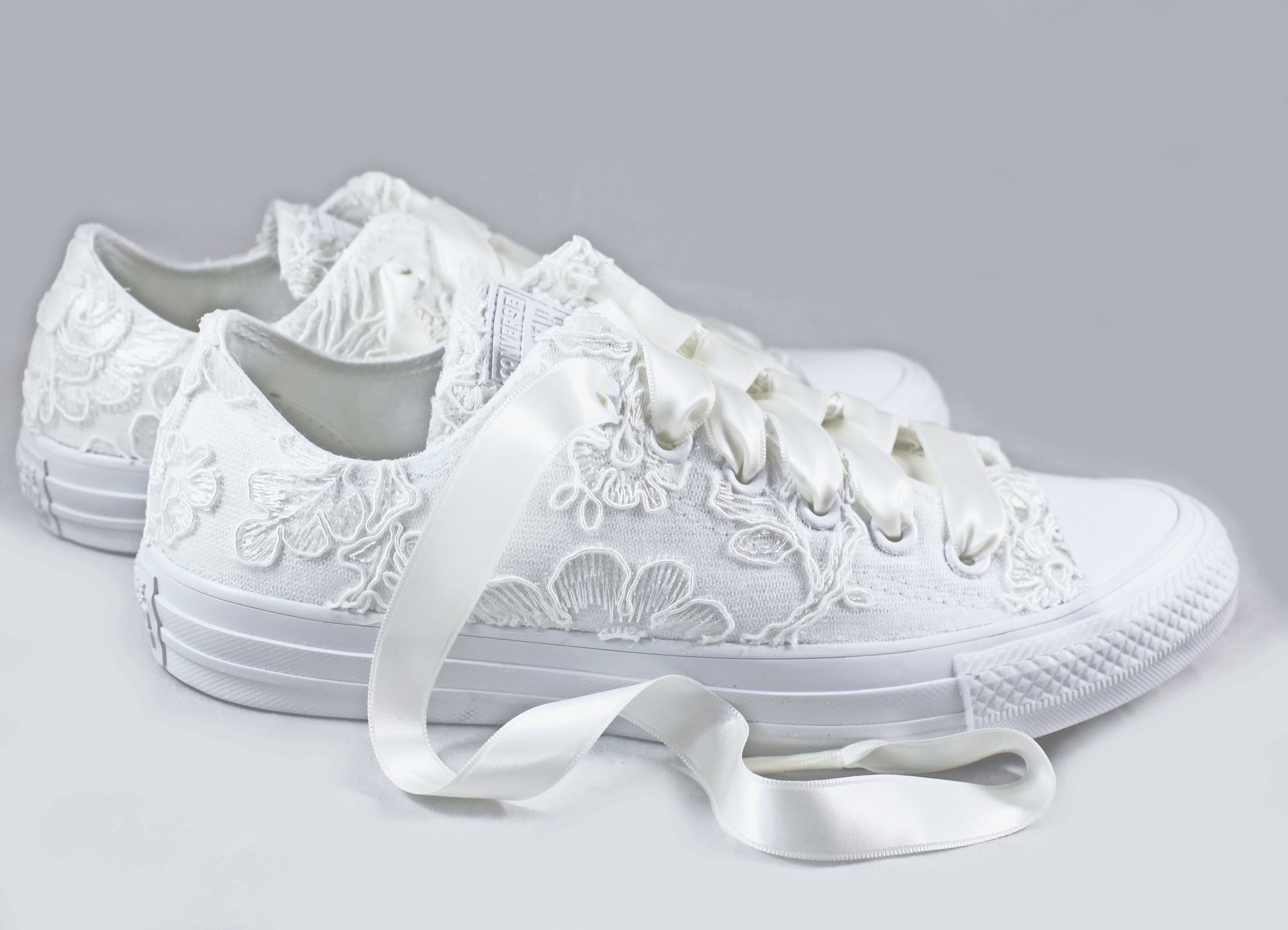Pictured with white Monochrome Converses with floral ivory lace and ivory ribbon shoelaces.